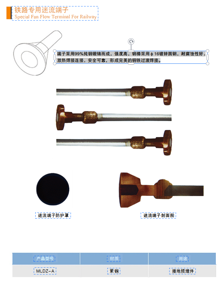 端子采用99%純鋼鍛鑄而成,強度高,鋼棒采用φ16鍍鋅圓鋼,耐腐性性好。放熱焊接連接,安全可靠,形成完美的鋼鐵過渡焊接。